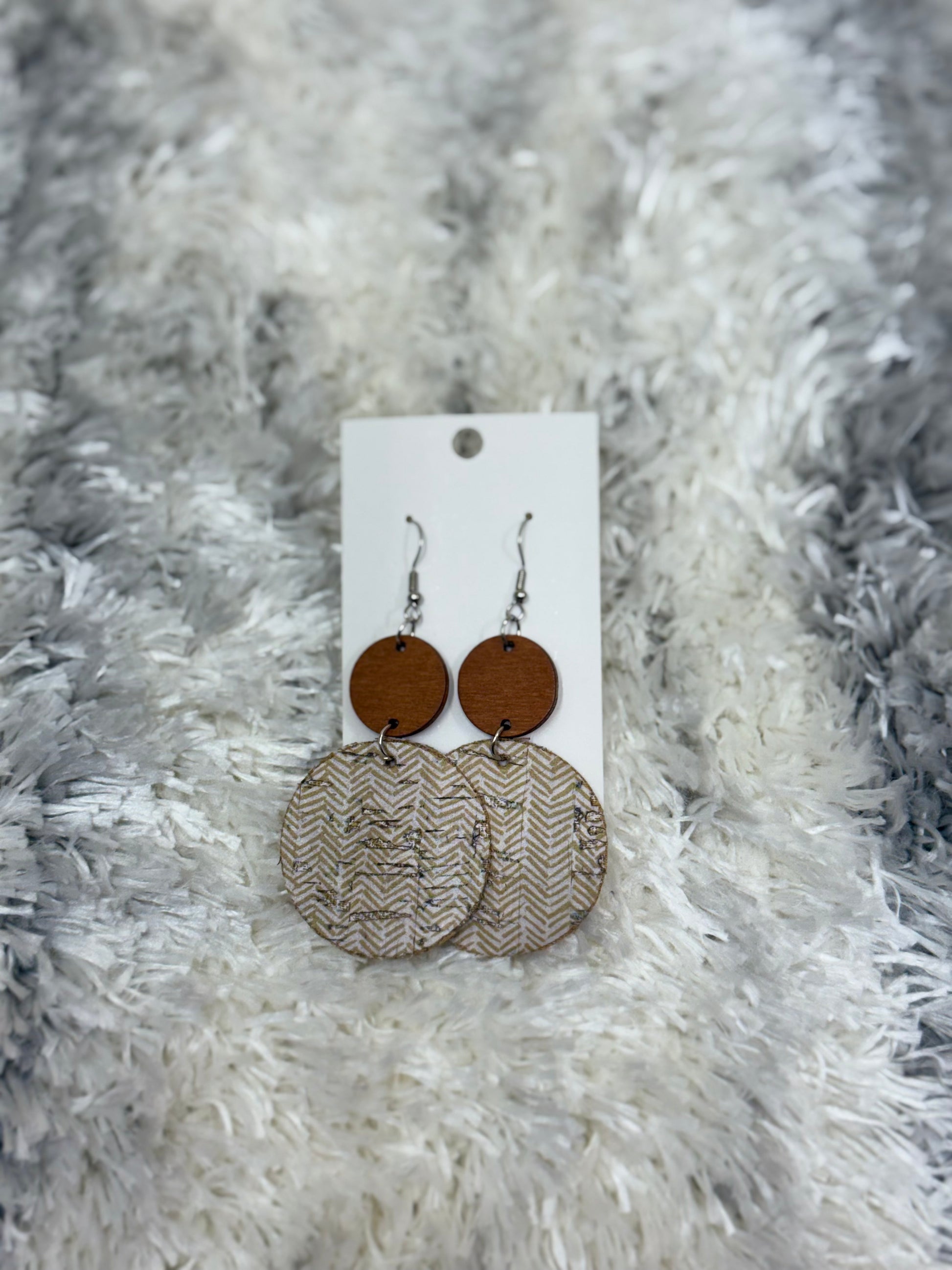 Lightweight wooden earrings with a cork circle and gold patterned disc. A chic mix of earthy and contemporary style.