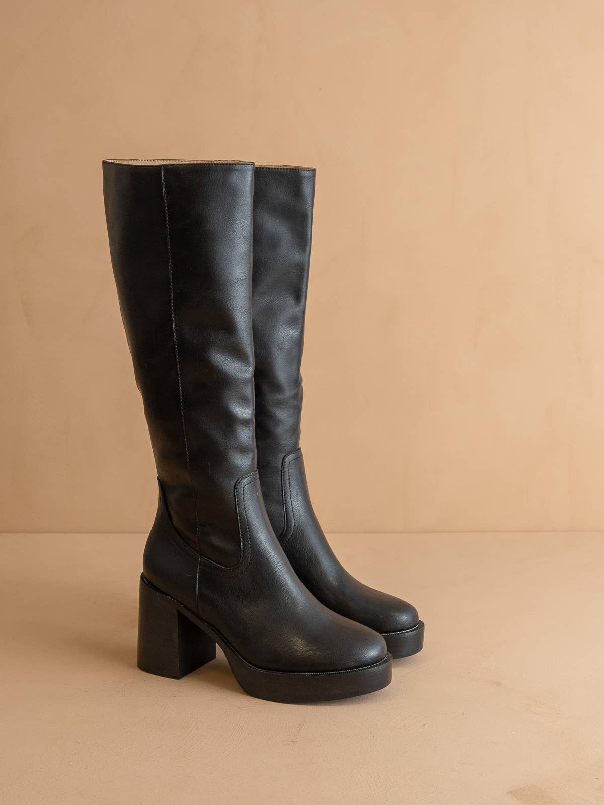 Chic, bold, and made for dancing through the decades. These boots bring a touch of retro glam with a modern twist. Featuring a chunky block heel, smooth black finish, and sleek knee-high design. They're the ultimate show-stopping boots for pairing with dresses, skirts, or your favorite vintage denim.