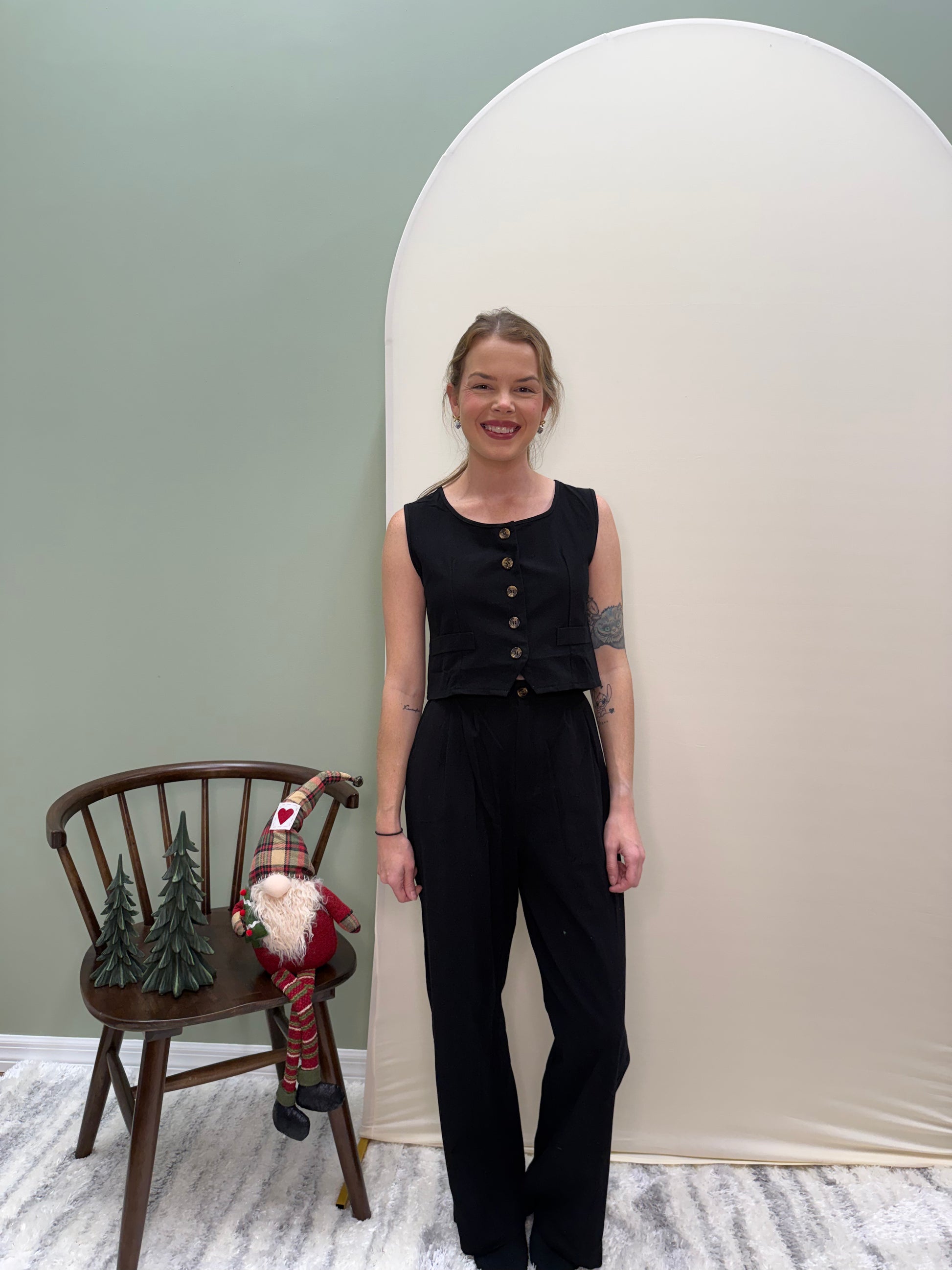 A chic two-piece set crafted from premium cotton blend for breathable comfort and easy style. Features a cropped button down vest with faux pockets paired with wide leg pants designed with side pockets, elastic waistband, and zipper closure. Lightweight and versatile.